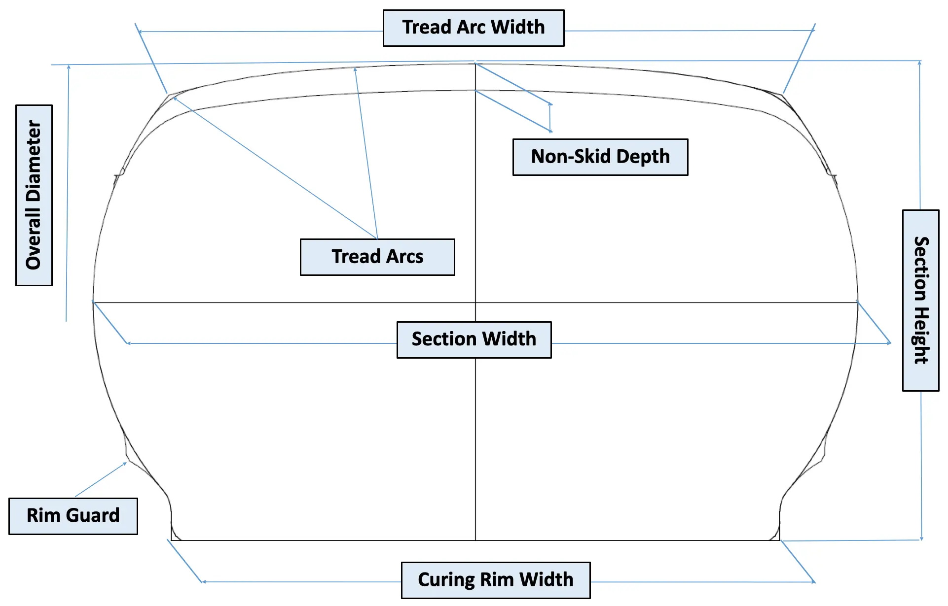 Arc de bande de roulement (ou rayon) – la surface extérieure du profil de la bande de roulement est composée d’arcs ou de rayons circulaires, plus plats ou plus arrondis selon le type de pneu et les performances visées. Près du centre de la bande de roulement, les rayons sont généralement très plats, tandis qu’au niveau de l’épaule ils présentent des diamètres beaucoup plus petits (et donc plus arrondis).